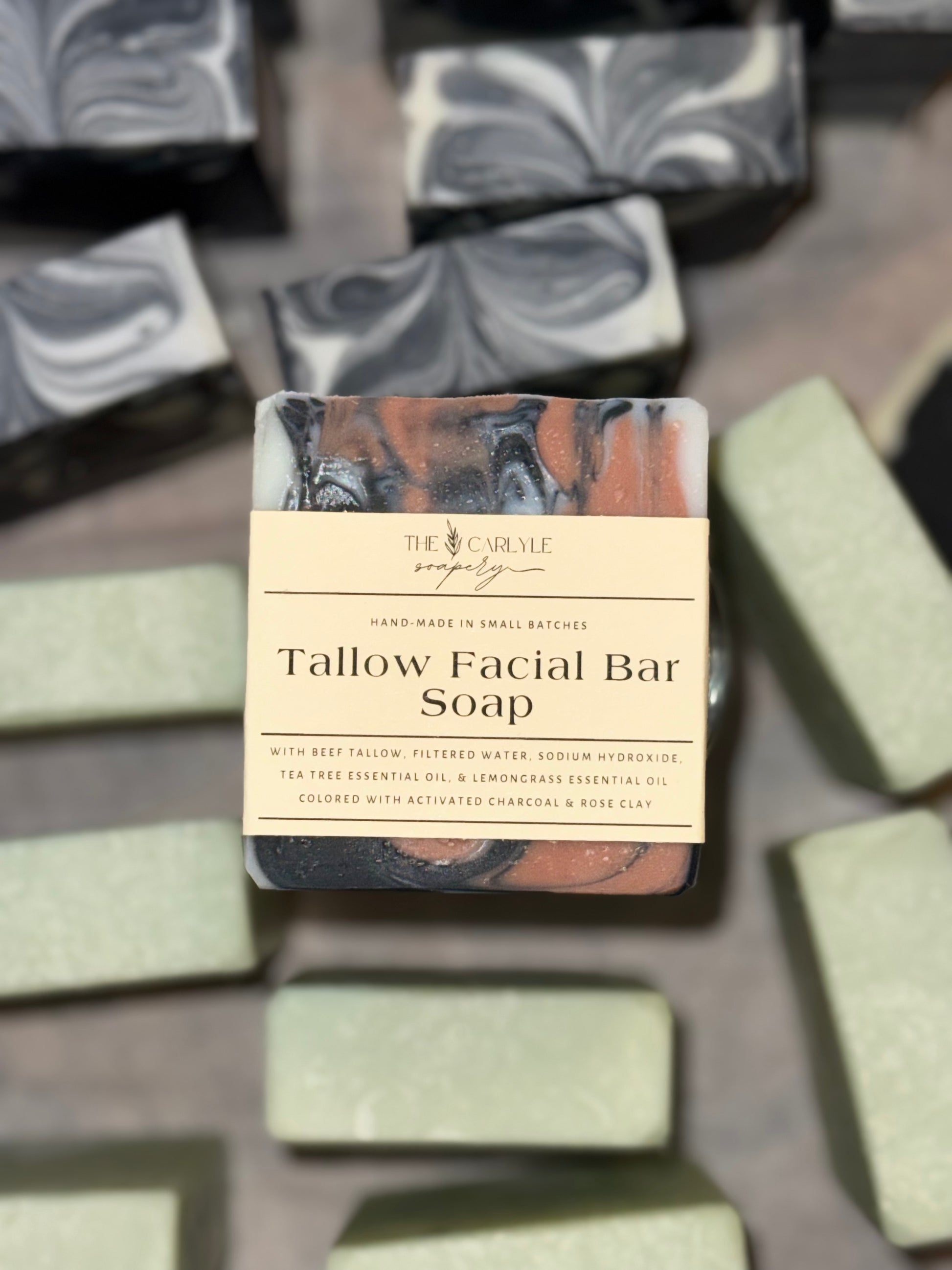 Ingredients: Beef tallow, filtered water, sodium hydroxide, tea tree essential oil, lemongrass essential oil, activated charcoal, rose clay.